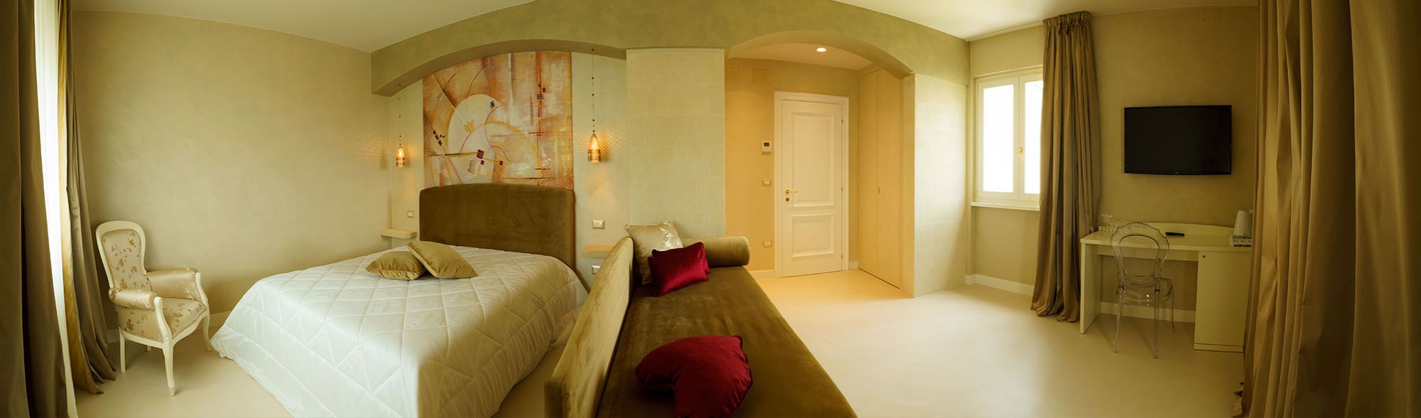Guests will find a comfortable bathroom in warm autumnal tones, equipped with an emotional shower with chromotherapy. The suite is equipped with a safe, minibar, and LCD satellite TV. The air conditioning is independent.