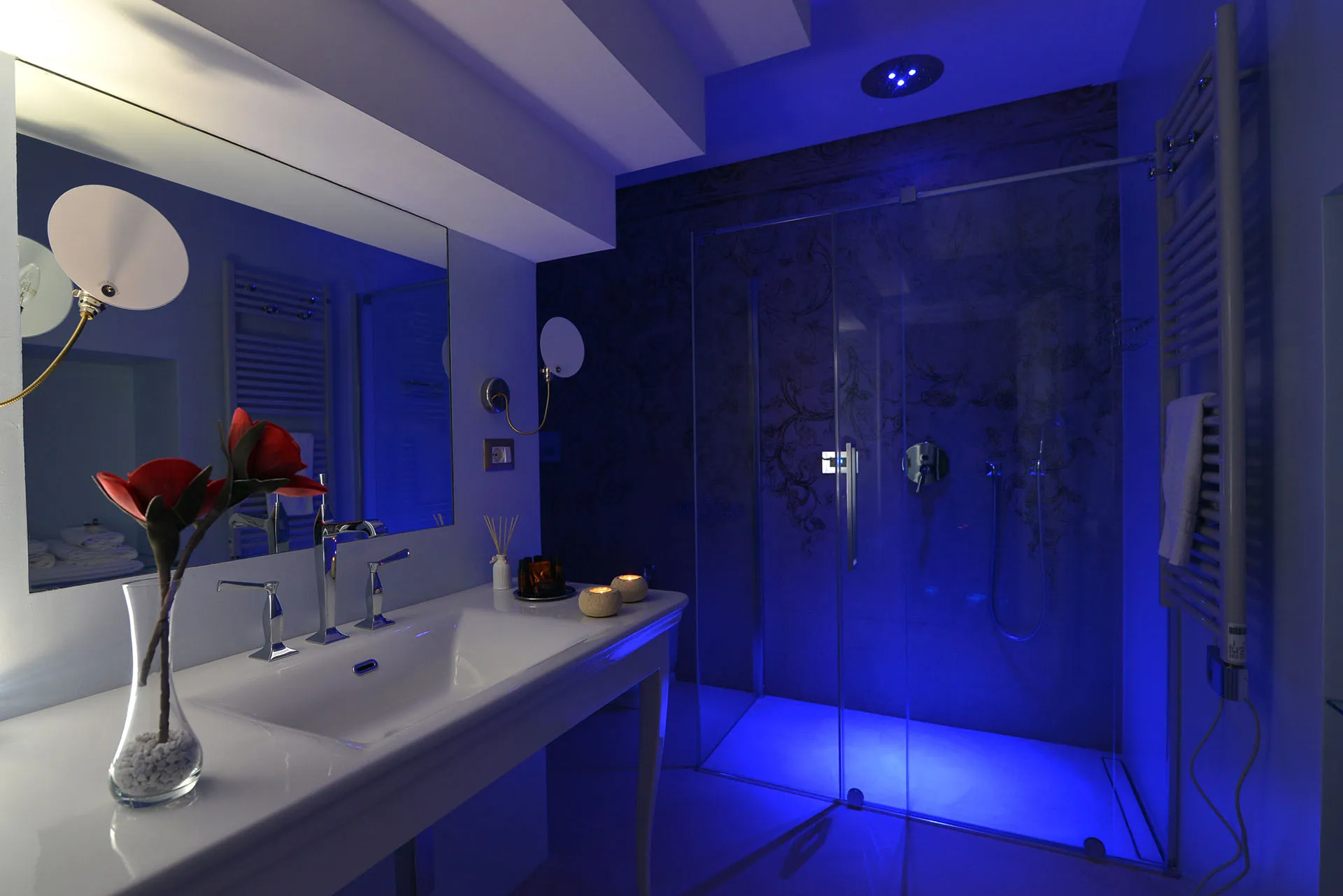 L'ampio bagno, elegante e funzionale, dispone di una doccia emozionale con cromoterapia, soffici asciugamani di spugna, confortevoli pantofole e accappatoi per il confort dei nostri ospiti.